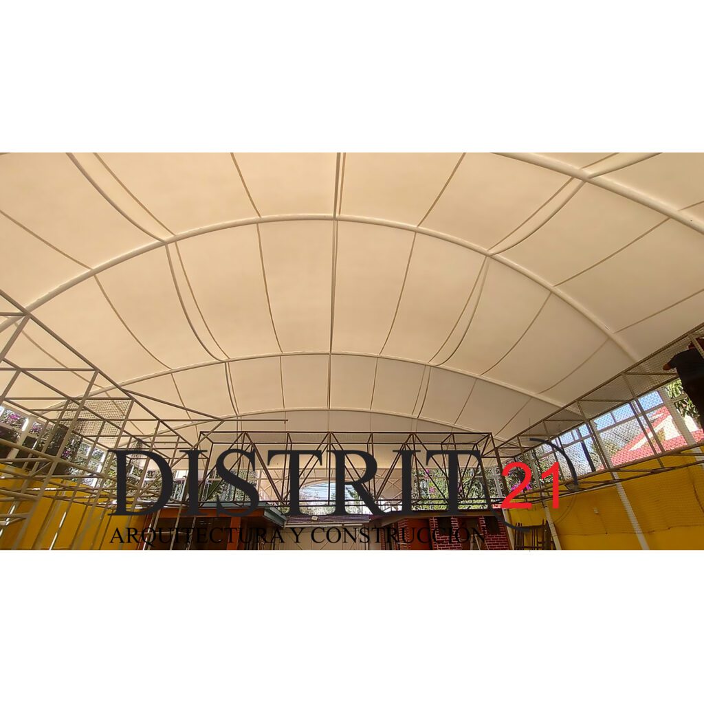 Velaría cóncava de 255m2 confeccionada con membrana arquitectónica traslucida marca Melher FR-750 ECLIPSE con propiedades térmicas y acústicas.
